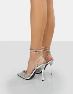 Glisten Silver Metallic Clear Diamante Wrap Around Pointed Toe Heels