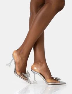 Vibez Silver Mirror Metallic Diamante Flower Broach Strappy Perspex Cake Stand Pointed Toe Heels