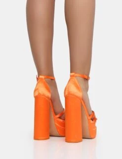 Enya Orange Satin Strappy Buckle Square Toe Platform Block Heels