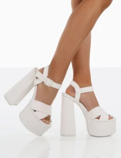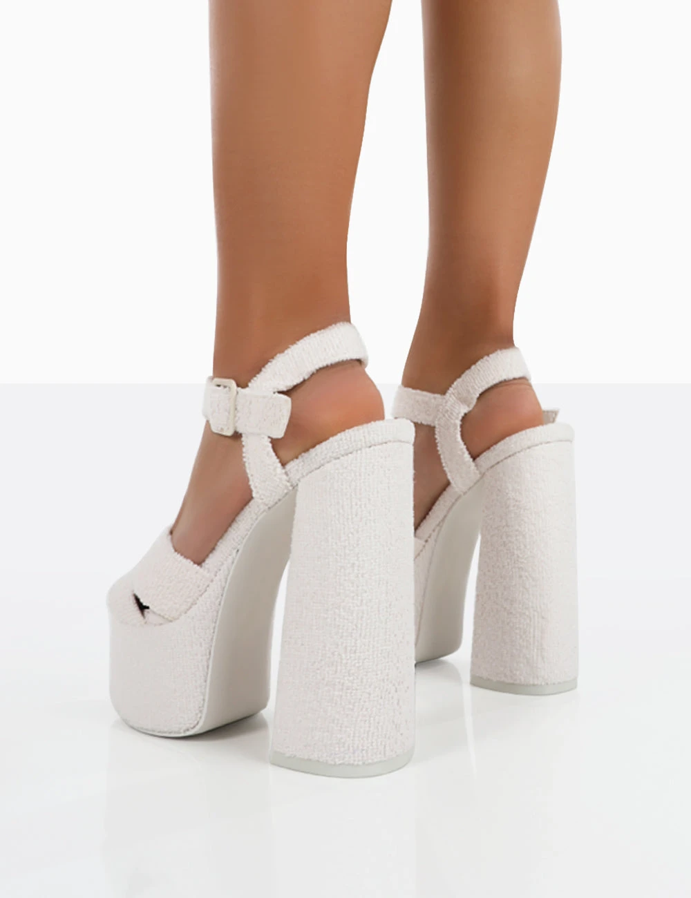 Mcloughlin Girls by PD x Kaiia, the first ever TikTok fashion collection to launch. It’s time to bring that main character energy with Content ecru. These statement platform heels in towelling material will add extra height and edge to your out out looks.