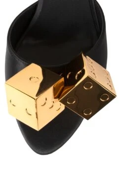 Heeled sculpted stiletto open-toe mule with dice embellishment