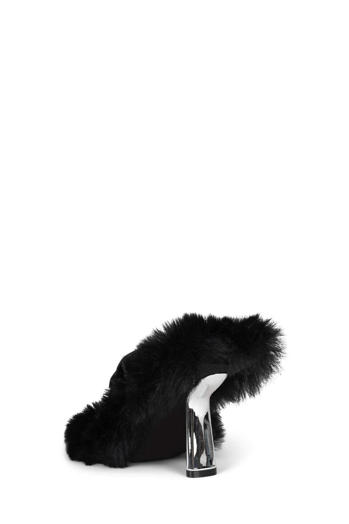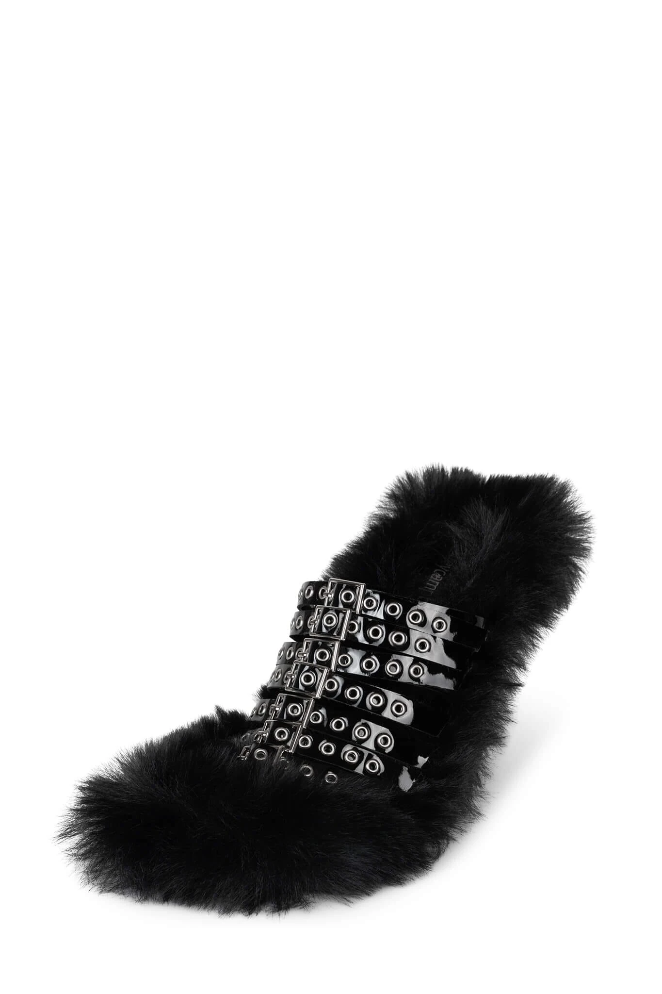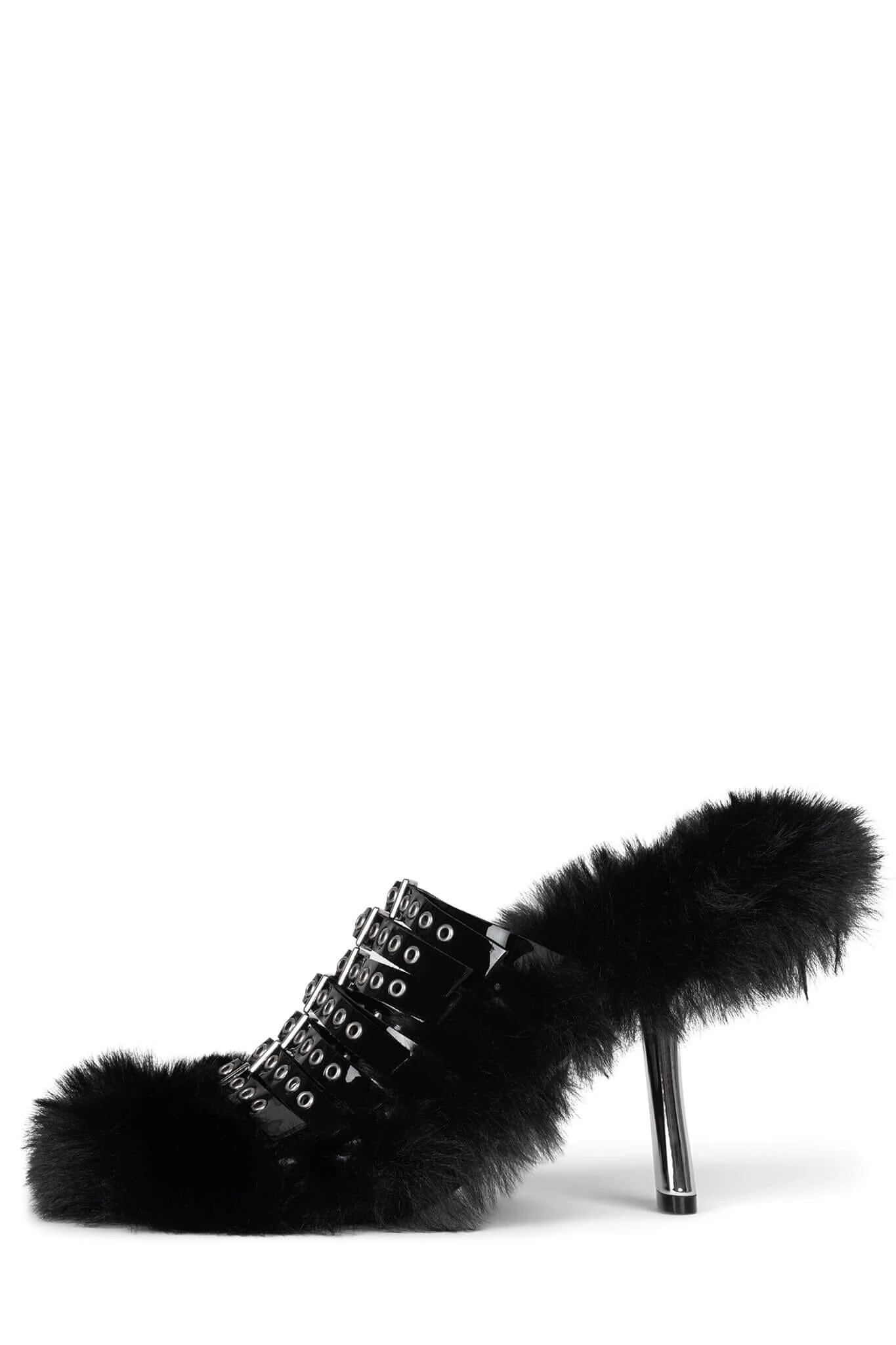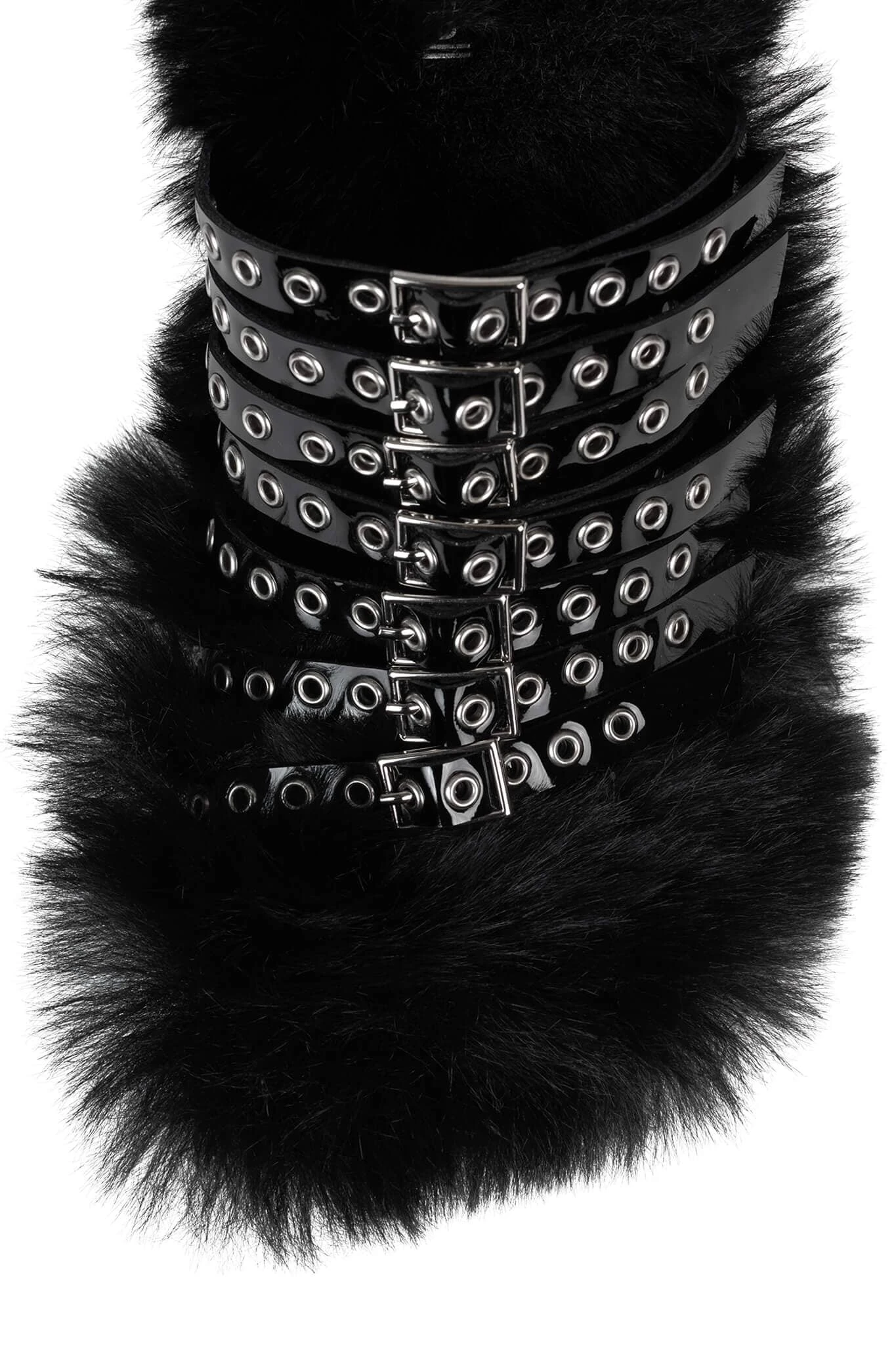 Faux-fur sandal with buckled strap detail and sculpted heel