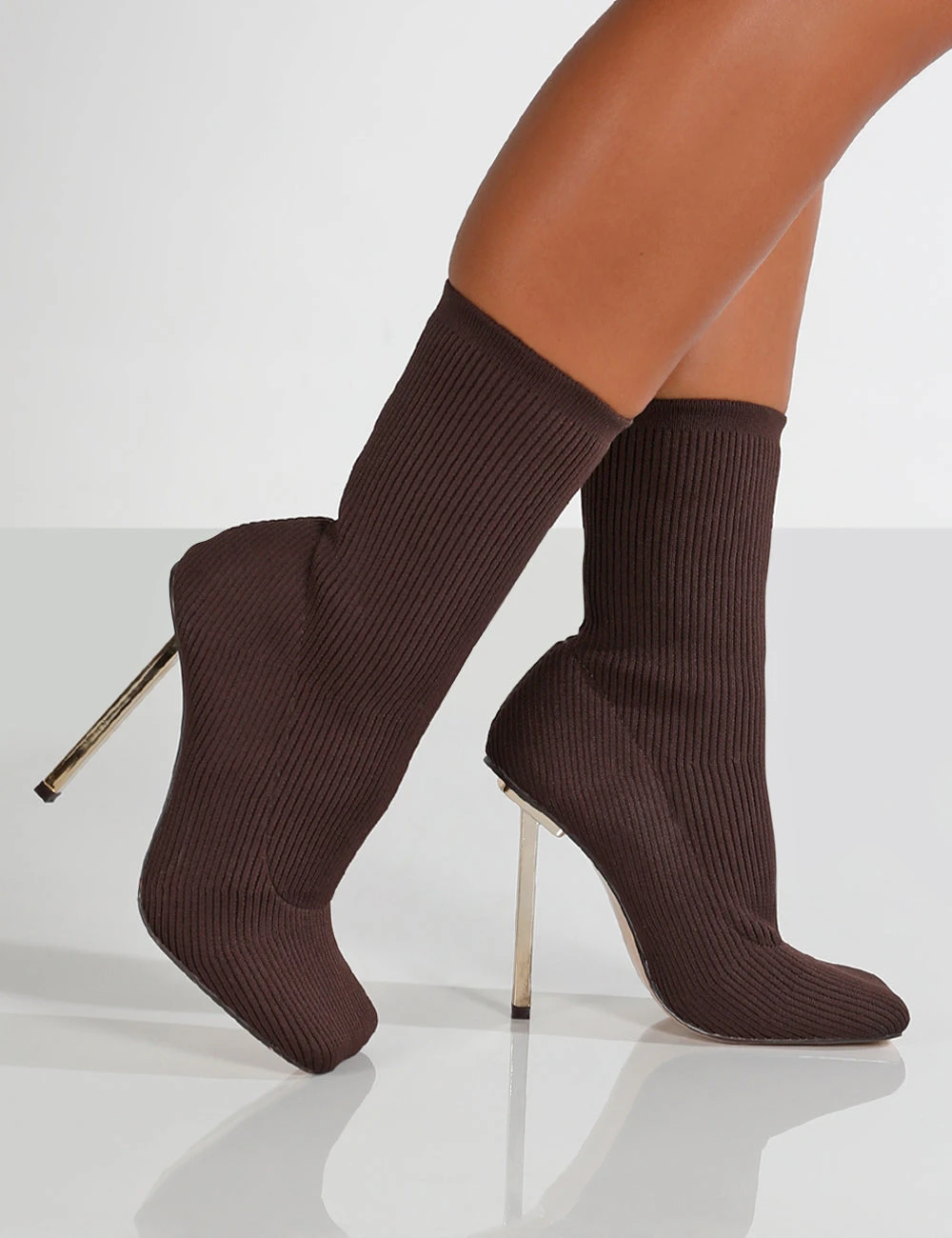 Introducing your new weekend faves- Souffle! A stunning brown knit sock boot featuring a statement stiletto heel. These beauties are guaranteed to level up your out out look and will add that extra height we all love. Brown is the colour of the season and is an absolute essential for any girl wanting to stay on trend. We’re teaming these ankle boots with a black bodycon co-ord and a mini green handbag. .