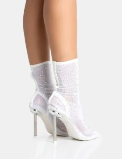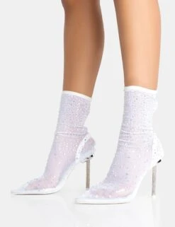 Our VIP White Diamante Detailed Mesh Pointed Toe Stiletto Sock Boot Heels, the epitome of sleek and stylish footwear that will take your fashion game to the next level. These boots are designed to be on fleek, combining trendy elements with dazzling details. You can be sure to turn heads and feel like a true VIP. Whether you’re attending a special event, a night out with friends, or simply want to elevate your everyday style, these boots will add a touch of flair and glamour to any ensemble.